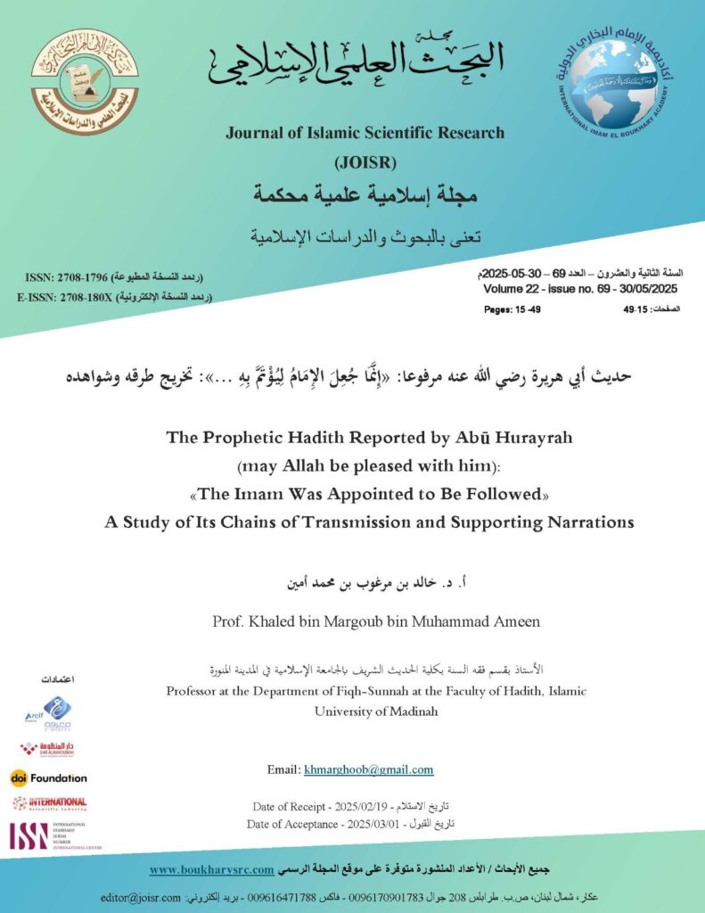 This study presents a scholarly investigation into the takhrīj (referencing and verification) of a noble Prophetic ḥadīth reported by Abū Hurayrah (may Allah be pleased with him), in which the Prophet ﷺ said: “The imam was appointed to be followed…” This narration consists of multiple clauses and serves as a foundational text in various jurisprudential matters related to the nature of prayer and congregational worship.