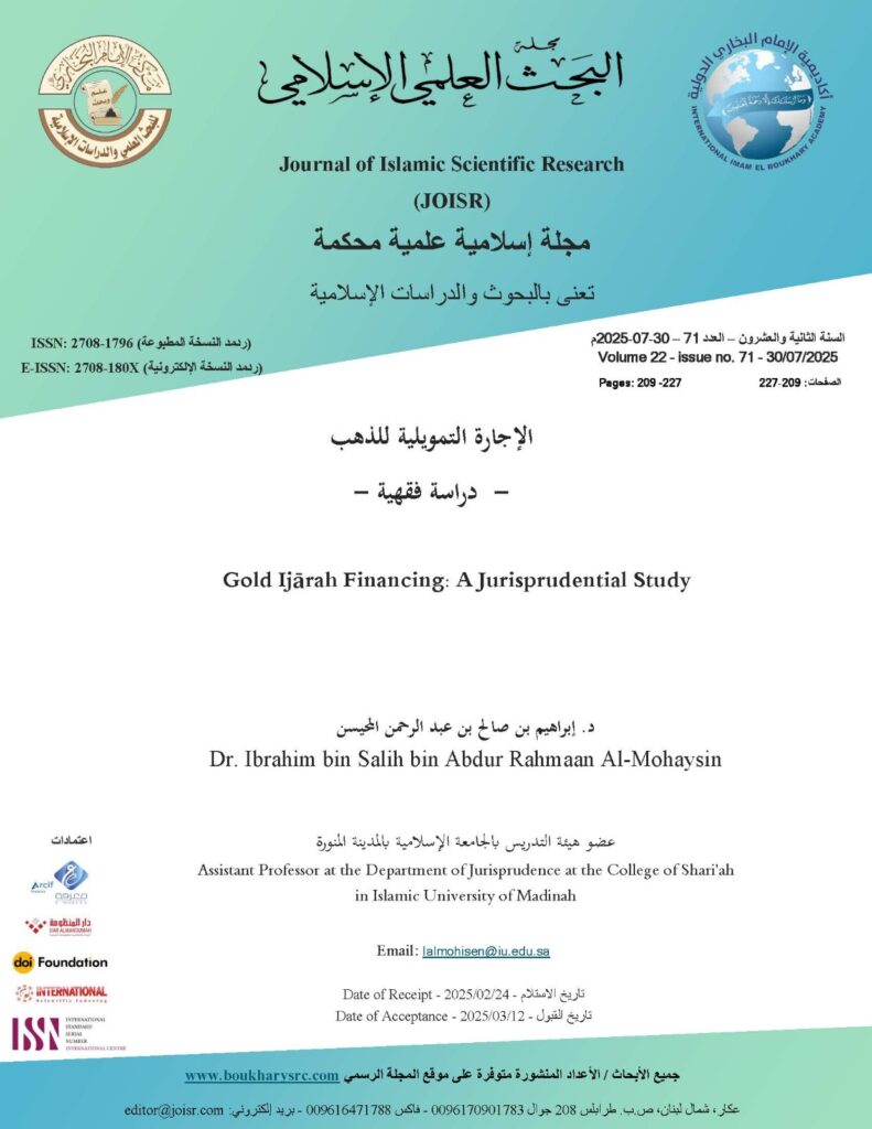 This research examines the concept of Ijārah financing (financial leasing) and its contemporary applications involving gold through an applied jurisprudential study. The significance of the topic lies in the unique Sharia and economic characteristics of gold, which directly impact financial and investment products. As financial leasing is a prevalent structure in financing contracts, examining its application to gold constitutes a subject of particular importance.