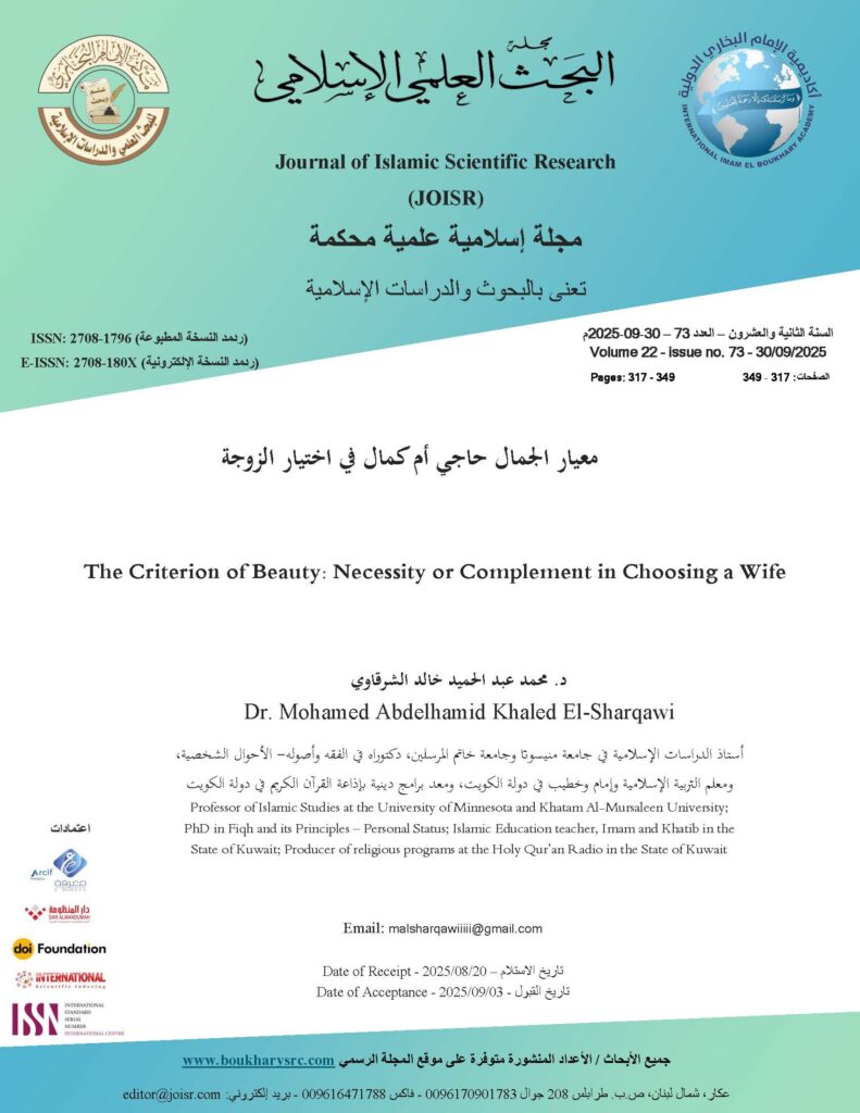 This study aims to explore the significance of the criterion of beauty in choosing a wife from the perspective of Islamic Sharia, through examining the Prophet’s (PBUH) selection of his wives. The objective is to determine the position of this criterion among necessities, needs, and complements. The study explains the concept of beauty, as well as the notions of necessities and complements. It also clarifies the Sharia’s view regarding the criterion of beauty in choosing a wife and the natural human inclination towards beauty as a divine blessing in this world and the Hereafter. Moreover, it highlights that one of the wisdoms behind the legislation of looking at a prospective bride prior to marriage is the consideration of beauty. The study further discusses Sharia’s encouragement to choose the most beautiful wife and establishes that a woman’s beautification for her husband is a religious duty and a sign of her righteousness. Additionally, it illustrates the extent to which the Prophet (PBUH) considered beauty when choosing his wives.
