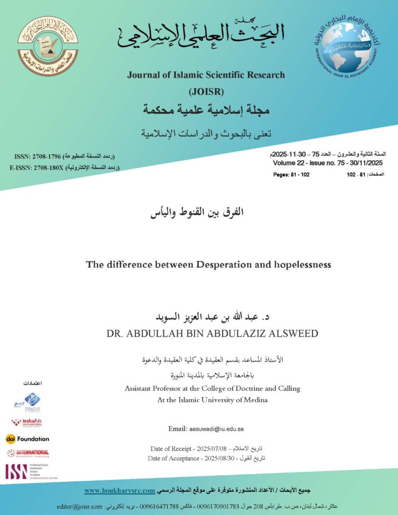 يهدف هذا البحث إلى ذكر أقوال أهل العلم في تعريف القنوط واليأس، وبيان الفرق بينهما، والفرق بين اليأس والاستيئاس، وأقسام كل نوع منها، وقد اتبعت فيه المنهج الاستقرائي.