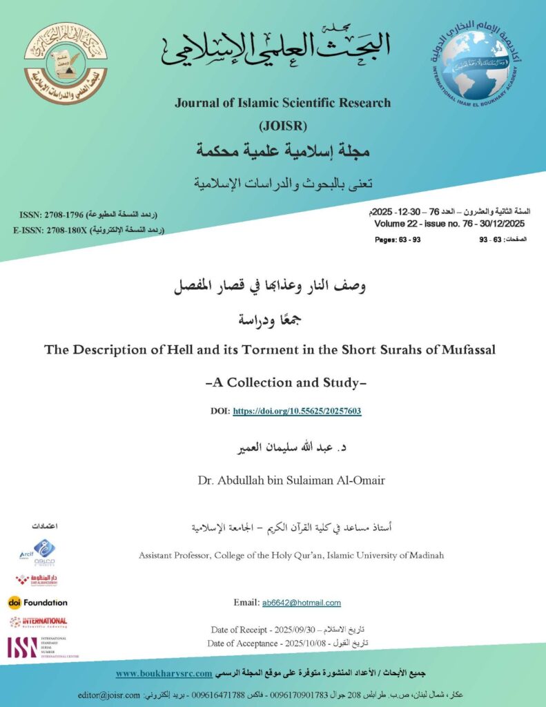 This study, titled “The Description of Hell and its Torment in the Short Surahs of Mufassal – A Collection and Study,” focuses on the short surahs of Mufassal due to their frequent recitation and memorization among Muslims, both scholars and laymen. However, the repetition of recitation often leads to a lack of contemplation on their meanings. This study aims to alert and warn people through the exploration of these surahs, which they are accustomed to. The research methodology employed is based on inductive and analytical approaches, divided into two main sections: the first section describes hell, studied through three subtopics, and the second section covers the descriptions of hell’s torment and those who deserve it, studied through seven subtopics. The study concludes with several findings, most notably that the torment in hell is not limited to physical punishment but also includes psychological and spiritual suffering. It also highlights that some descriptions of torment in the short surahs of Mufassal, though seemingly specific, have broader implications. The study recommends further exploration of the legal rulings in the short surahs of Mufassal due to their relevance and importance.