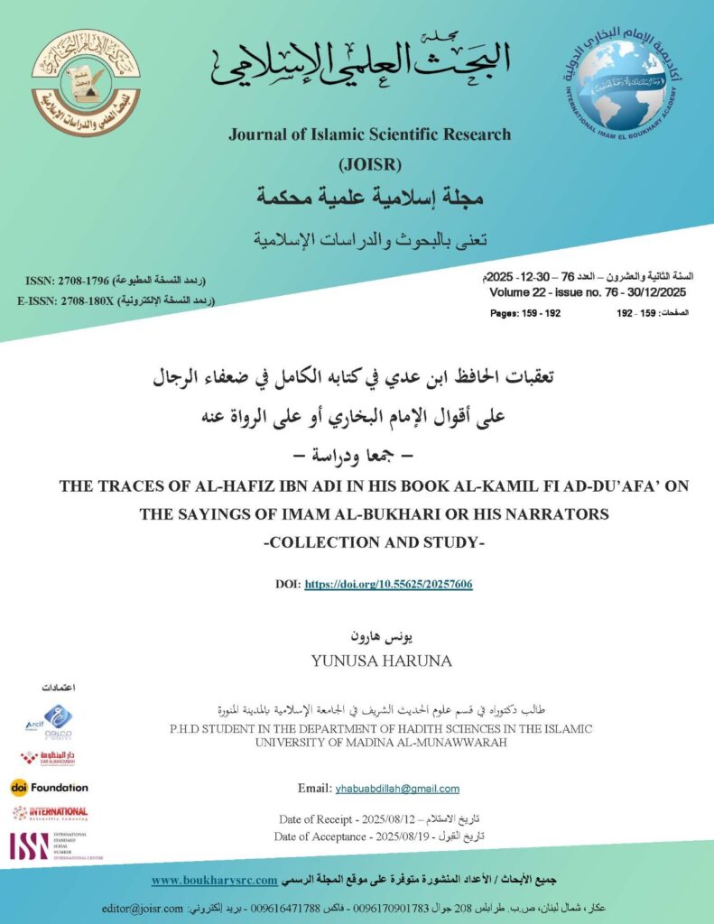 This research: (The Traces of Al-Hafiz Ibn Adi in His Book Al-Kamil fi ad-Du’afa on the Sayings of Imam al-Bukhari or His Narrators -Collection and Study-); aims to gather the issues in which Ibn Adi traced al-Bukhari or the narrators who transmitted his words in his book Al-Kamil, study them according to established scholarly principles, and highlight Ibn Adi’s methodology in doing so.