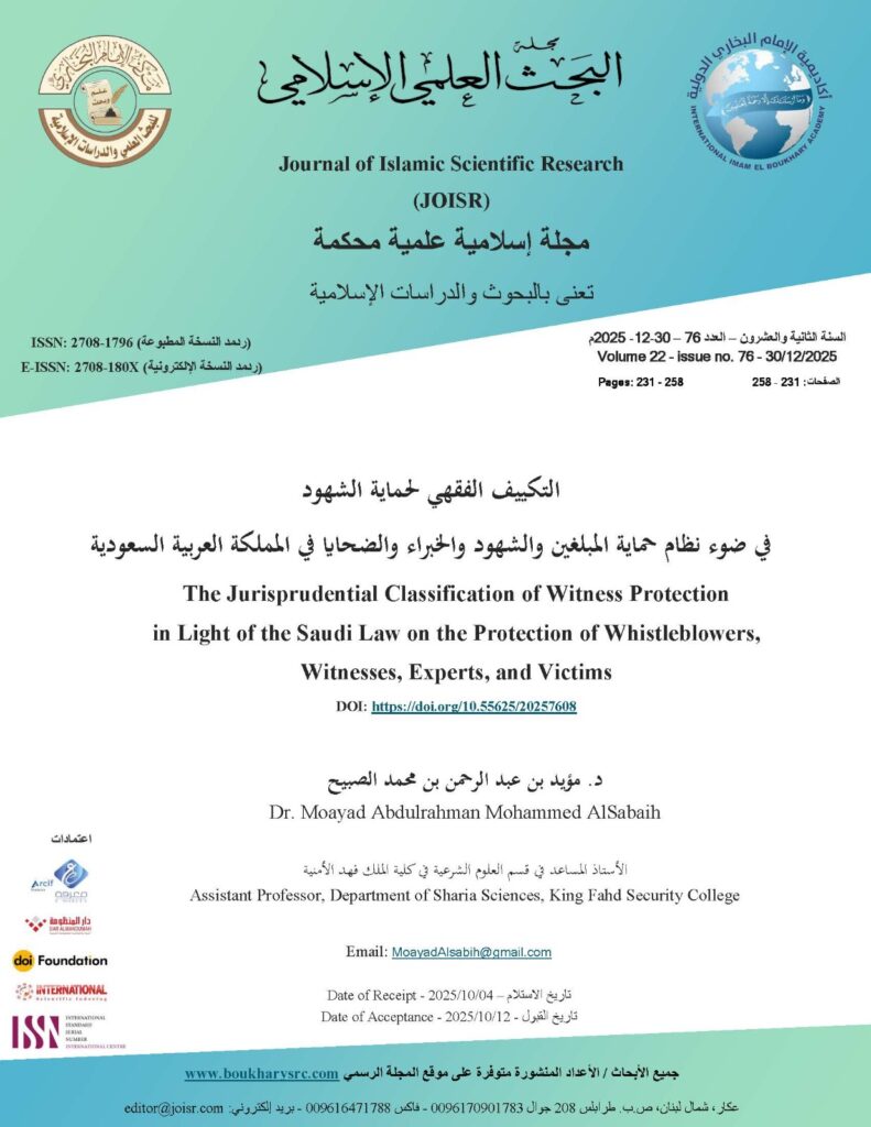 The research analyzes the Sharia foundations of this system, reviews protection mechanisms recognized in Islamic jurisprudence, and evaluates the extent to which the Saudi framework aligns with Sharia objectives and legal maxims. It also explores the impact of witness protection on ensuring judicial integrity, strengthening criminal justice, and enhancing both general and specific deterrence.