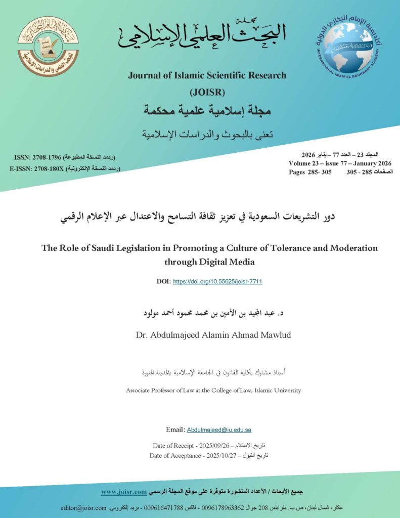 This research focuses on the role of Saudi legislation in promoting a culture of tolerance and moderation through digital media, employing a descriptive-analytical approach to review the legal and institutional framework and analyze its effectiveness in addressing contemporary challenges. The study highlights the importance of digital media as a key tool in shaping public awareness in the Kingdom, especially given the widespread use of social media platforms and digital content among Saudi youth, who represent a significant portion of the population.