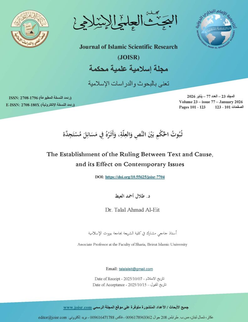 هذا البحث بعنوان ” ثبوت الحكم بين النص والعلة، وأثره في مسائل مستجدة” يلقي الضوء على بيان ثبوت الحكم، في مسائل حادثة تتطلّب اجتهاداً للحكم عليها، لا سيما في ميدان الطبّ وعلوم الأحياء؛ حيث إن هذه المسائل غير مبنية على نصّ صريح.