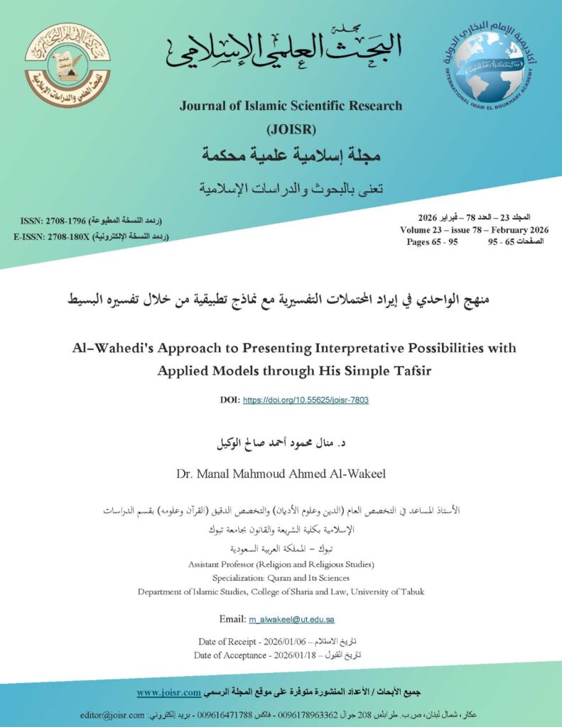 This research examines Imam al-Wahidi’s approach to presenting interpretive possibilities through his simple interpretation. The study focuses on explaining the concept of possibility in interpretation and its importance in expanding the scope of Quranic meaning without straying beyond the limits of legal and linguistic controls.