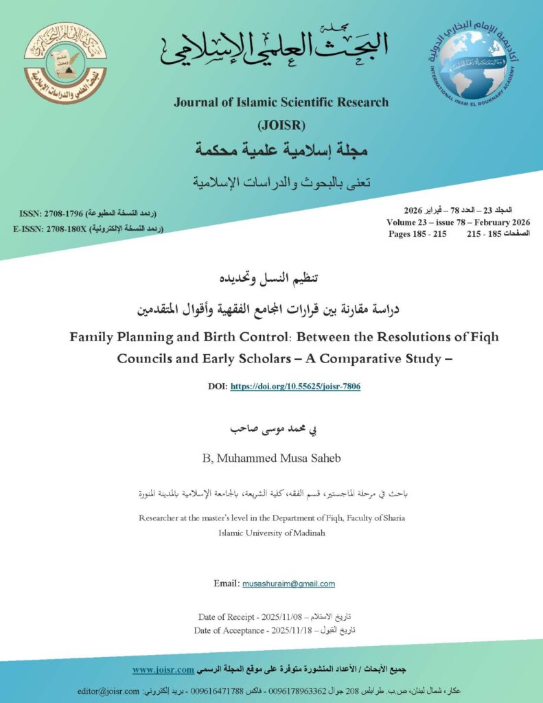 This study aims to examine the Islamic legal ruling on family planning and birth control through a comparative analysis of classical juristic opinions and contemporary resolutions issued by modern Fiqh councils, in light of the objectives of Islamic law (Maqāṣid al-Sharīʿahr) and current realities.