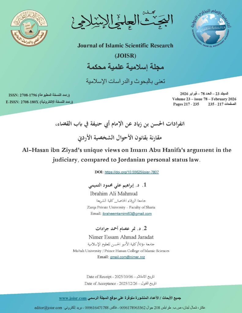 In this research, I explained the biography and status of this eminent scholar, then I explained the issues that were unique to him, and the study concluded that Al-Hasan ibn Ziyad had unique narrations on the authority of Imam Abu Hanifa that express his opinion regarding what he adopted in Hanafi jurisprudence, and I collected the most prominent of these issues in Chapter on the judiciary and its comparison with the Jordanian Personal Status Law.