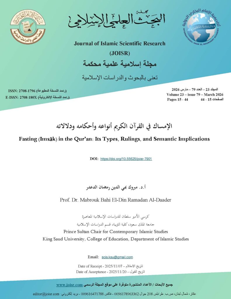 رركز هذا البحث على لفظ الإمساك في القرآن الكريم من منظور موضوعي، يدمج بين البُعد الصحي والروحي. وقد تضمن البحث مراجعة الآيات القرآنية التي تناولت الإمساك بأنواعه المختلفة، سواء كان إمساكًا عن الطعام والشراب خلال الصيام، أو إمساكًا عن الأفعال المحرمة، أو ضبطًا للرغبات والمعاملات.