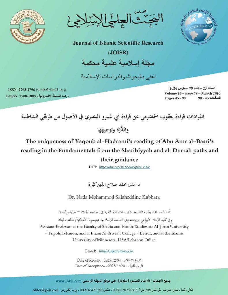 This study aims to compile the unique readings of Yaqub al-Hadrami from Abu amr al-Basri, according to the methods of al-Shatibiyyah and al-Durrah, based on the agreed-upon principles and rules between them, while also providing guidance on these unique readings. The study’s significance stems from its examination of a subtle aspect of the science of Quranic readings, highlighting the diversity of readings within a single school, deepening scholarly understanding, and emphasizing the reader’s obligation to meticulously record and verify the narrations and their methods according to the established practices of the scholars of recitation. Furthermore, the study addresses the challenge of facilitating the learning of students who have mastered the reading of Abu Amr al-Basri, or who have mastered the seven readings from al-Shatibiyyah but have not had the opportunity to study the three readings that complete the ten from the text of al-Durrah. Based on this challenge, several questions arise, most notably: Does compiling these unique readings play a role in facilitating Yaqub’s reading for those proficient in the seven readings or only in the reading of al-Basri? The study confirmed the proposed hypotheses, most importantly that there are unique readings of Ya’qub from al-Basri in the fundamentals of recitation, which are easy to perform. Collecting these readings contributes significantly to understanding the fundamentals of Ya’qub’s recitation. The study employed an inductive approach to identify these unique readings, a deductive approach to interpret them, and an analytical approach to examine the aspects of these unique readings in terms of the fundamental principles. The plan comprises an introduction, a preface, three sections, and a conclusion. Among the most prominent findings are: